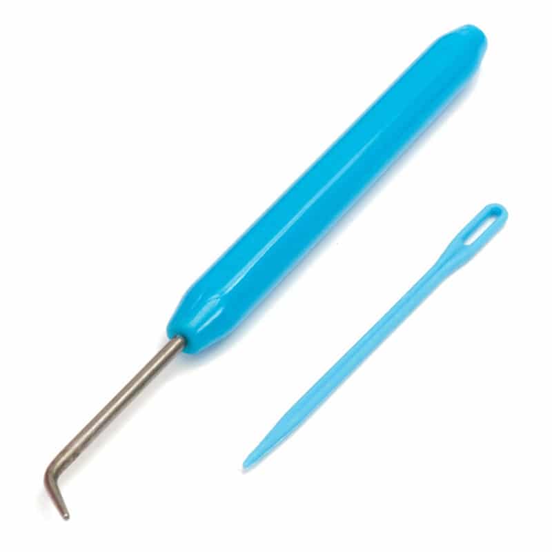 Knitting loom ini terbuat dari bahan plastik buatan China. 1 set knitting loom bentuk panjang ini berisi item sebagai berikut: